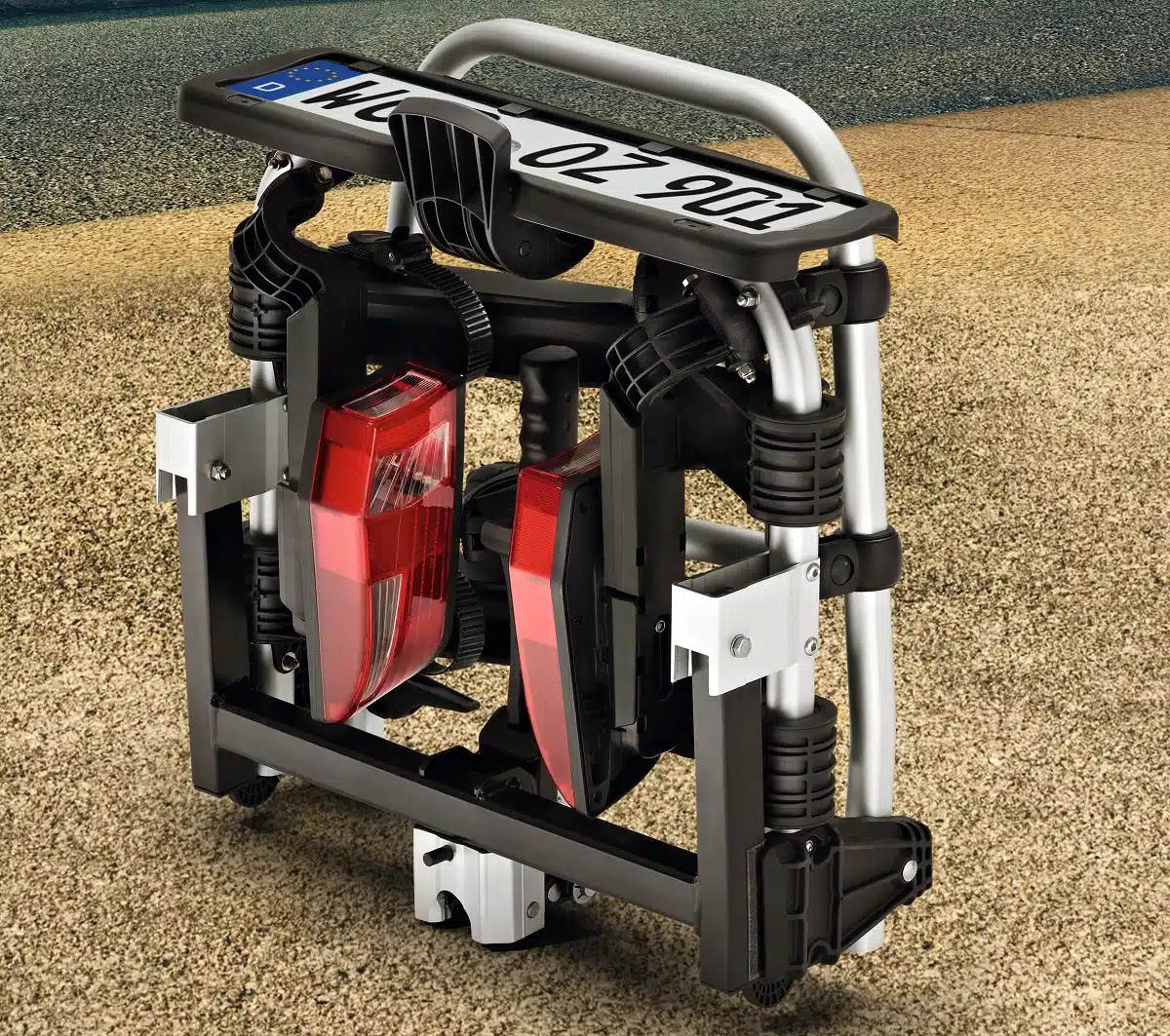 Der Fahrradträger von Volkswagen verfügt über ein Fußpedal, mit dem Sie den Träger dank des großen Abklappwinkels extra weit abklappen können. So haben Sie auch bei Fahrzeugen mit großen Heckklappen problemlos Zugriff zum Kofferraum. Wenn Sie den Träger nicht benötigen, können Sie ihn auf ein kleines Packmaß zusammenklappen und verstauen.